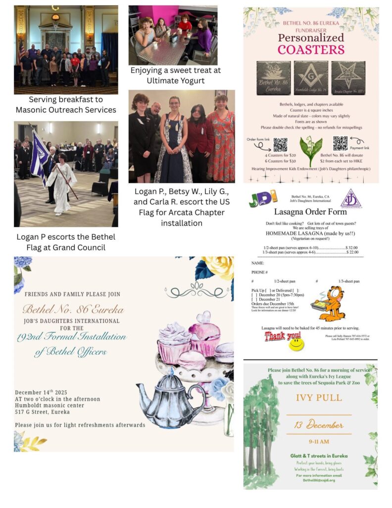 The last day to order lasagnas to go is Dec. 15. Talk to any one of our members to get your order in, or email bethel86@cajdi.org. There is also the option to have dinner on the night of Dec. 20th which comes with a roll, some salad, and a dessert. Dinner tickets are $20/ person, $35/ couple, and $10/ kids 10 & under. Please email the bethel to reserve your spot!December starts off with our business meeting on the 1st that all are welcome to attend. We meet at the Masonic Center at 517 G street starting at 7PM. On Saturday the 13th we will be pulling ivy for Sequoia Park & Zoo meeting on Glatt & T streets. Come join us with boots and gloves in your Masonic family shirt from 9-11. Bring a friend and let’s show off what we can do! The next day is our formal installation of bethel officers, Dec 14th at 2 in the afternoon. The theme is Alice in Wonderland with a light tea party reception. And, the following evening is our 1st regalia meeting of the new term at 7PM. December 20th you will find us making lasagnas for pick up and serving them at the hall at 5:30. Throughout the busy month of December, we look forward to seeing you at various events!