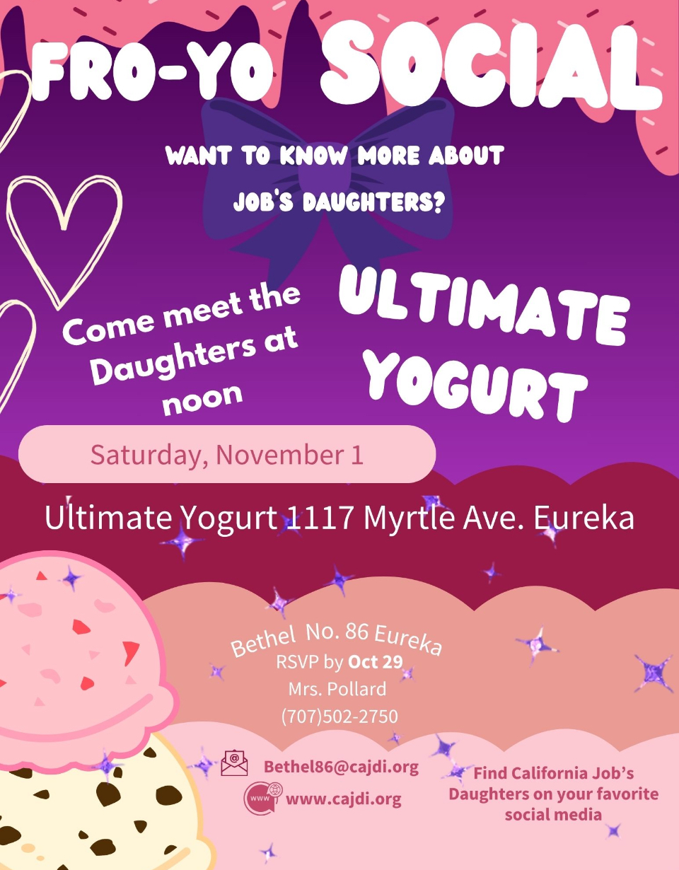 Starting off November, Bethel 86 will be serving breakfast on the first for the Masonic Outreach Services informational gathering at 8. At noon on the same day, we invite friends to Ultimate Yogurt fro-yo social! If you have a daughter, niece or even a neighbor who likes frozen treats she is welcome! Email Bethel86@cajdi.org for more details. Our open business meeting is on Nov. 3rd at 7. If you come at 6:20, you can also get a tour of the lodge building! Later in the month is Grand Council. We also are planning to escort the flag for some upcoming OES installations.