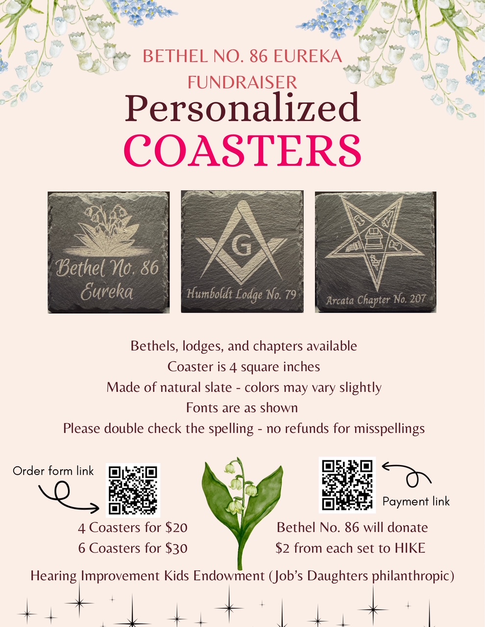 Our current fundraiser is selling Masonic family coasters. See the flier for more details. Save the date in December for our Lasagna dinner sales. December 20th we will be making lasagnas fresh to go, or you can buy dinner tickets and enjoy a lasagna dinner. More information on the lasagna flier or email Bethel86@cajdi.org. Tickets and sales will begin Nov 3rd.